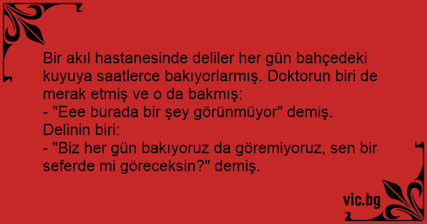Bir akıl hastanesinde deliler her gün bahçedeki kuyuya saatlerce bakıyorlarmış. Doktorun biri de merak etmiş ve o da bakmış: - "Eee burada bir şey görünmüyor" demiş. Delinin biri: - "Biz her gün bakıyoruz da göremiyoruz, sen bir seferde mi göreceksin?" demiş.