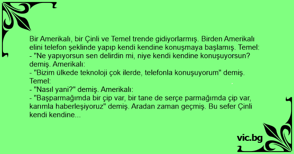 Bir Amerikalı, bir Çinli ve Temel trende gidiyorlarmış. Birden Amerikalı elini telefon şeklinde yapıp kendi kendine konuşmaya başlamış. Temel: