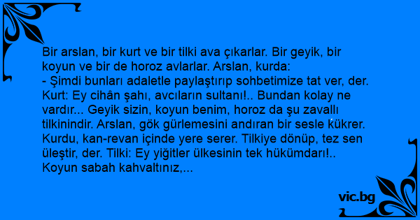 Kurt: Ey cihân şahı, avcıların sultanı!.. Bundan kolay ne vardır... Geyik sizin, koyun benim, horoz da şu zavallı tilkinindir. Arslan, gök gürlemesini andıran bir sesle kükrer. Kurdu, kan-revan içinde yere serer. Tilkiye dönüp, tez sen üleştir, der. Tilki: Ey yiğitler ülkesinin tek hükümdarı!..