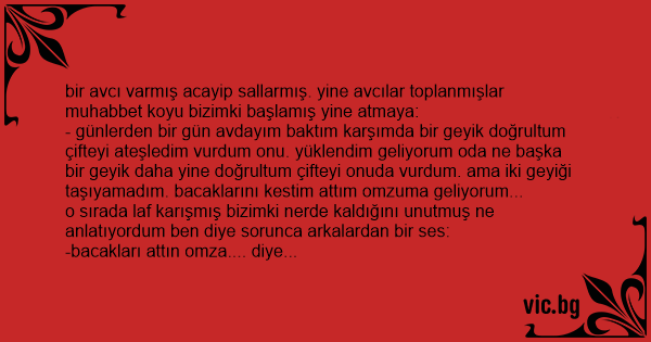 - günlerden bir gün avdayım baktım karşımda bir geyik doğrultum çifteyi ateşledim vurdum onu. yüklendim geliyorum oda ne başka bir geyik daha yine doğrultum çifteyi onuda vurdum. ama iki geyiği taşıyamadım. bacaklarını kestim attım omzuma geliyorum...
