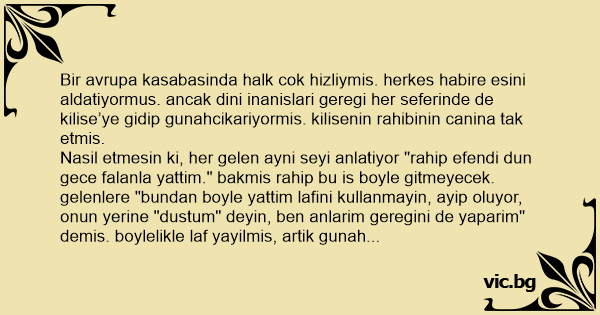 Bir avrupa kasabasinda halk сок hizliymis. herkes habire esini aldatiyormus. ancak dini inanislari geregi her seferinde de kilise’ye gidip gunahcikariyormis. kilisenin rahibinin canina tak etmis.