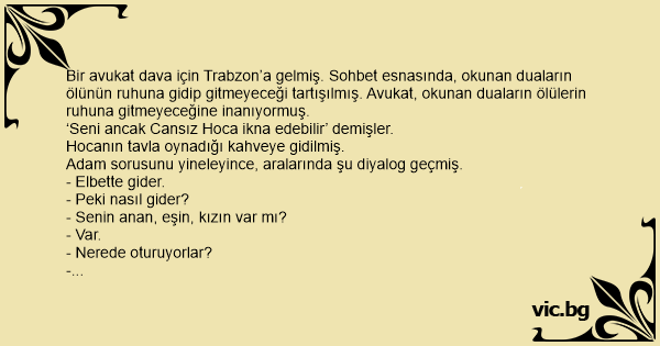 Bir avukat dava için Trabzon’a gelmiş. Sohbet esnasında, okunan duaların ölünün ruhuna gidip gitmeyeceği tartışılmış. Avukat, okunan duaların ölülerin ruhuna gitmeyeceğine inanıyormuş.