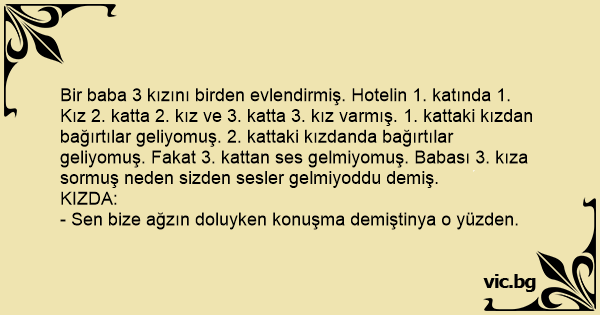 Bir baba 3 kızını birden evlendirmiş. Hotelin 1. katında 1. Kız 2. katta 2. kız ve 3. katta 3. kız varmış. 1. kattaki kızdan bağırtılar geliyomuş. 2. kattaki kızdanda bağırtılar geliyomuş. Fakat 3. kattan ses gelmiyomuş. Babası 3. kıza sormuş neden sizden sesler gelmiyoddu demiş.
