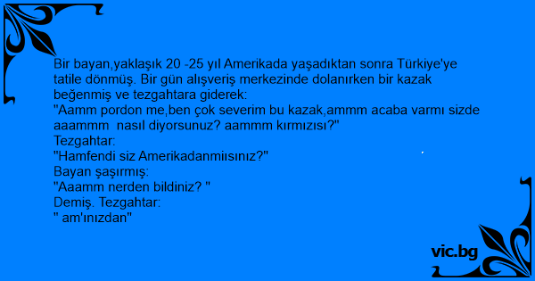 Bir bayan,yaklaşık 20 -25 yıl Amerikada yaşadıktan sonra Türkiye'ye tatile dönmüş. Bir gün alışveriş merkezinde dolanırken bir kazak beğenmiş ve tezgahtara giderek: