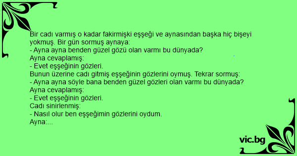 Bir cadı varmış o kadar fakirmişki eşşeği ve aynasından başka hiç bişeyi yokmuş. Bir gün sormuş aynaya: