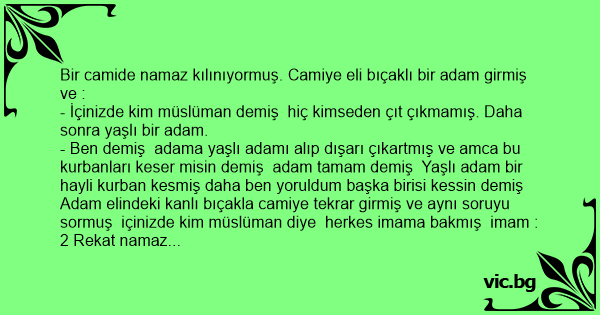 - Ben demiş adama yaşlı adamı alıp dışarı çıkartmış ve amca bu kurbanları keser misin demiş adam tamam demiş Yaşlı adam bir hayli kurban kesmiş daha ben yoruldum başka birisi kessin demiş Adam elindeki kanlı bıçakla camiye tekrar girmiş ve aynı soruyu sormuş içinizde kim müslüman diye herkes imama bakmış imam : 2 Rekat namaz kıldık diye müslüman mı oldunuz