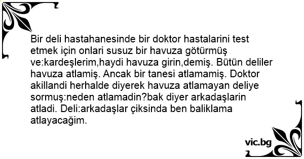 Bir deli hastahanesinde bir doktor hastalarini test etmek için onlari susuz bir havuza götürmüş ve:kardeşlerim,haydi havuza girin,demiş. Bütün deliler havuza atlamiş. Ancak bir tanesi atlamamiş. Doktor akillandi herhalde diyerek havuza atlamayan deliye sormuş:neden atlamadin?bak diyer arkadaşlarin atladi. Deli:arkadaşlar çiksinda ben baliklama atlayacağim.