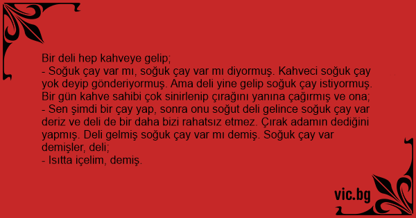 - Soğuk çay var mı, soğuk çay var mı diyormuş. Kahveci soğuk çay yok deyip gönderiyormuş. Ama deli yine gelip soğuk çay istiyormuş. Bir gün kahve sahibi çok sinirlenip çırağını yanına çağırmış ve ona;