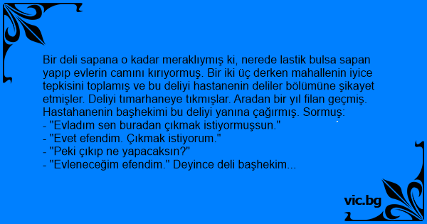 Bir deli sapana o kadar meraklıymış ki, nerede lastik bulsa sapan yapıp evlerin camını kırıyormuş. Bir iki üç derken mahallenin iyice tepkisini toplamış ve bu deliyi hastanenin deliler bölümüne şikayet etmişler. Deliyi tımarhaneye tıkmışlar. Aradan bir yıl filan geçmiş. Hastahanenin başhekimi bu deliyi yanına çağırmış. Sormuş: