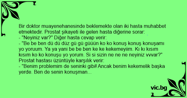 Bir doktor muayenehanesinde beklemekte olan iki hasta muhabbet etmektedir. Prostat şikayeti ile gelen hasta diğerine sorar: