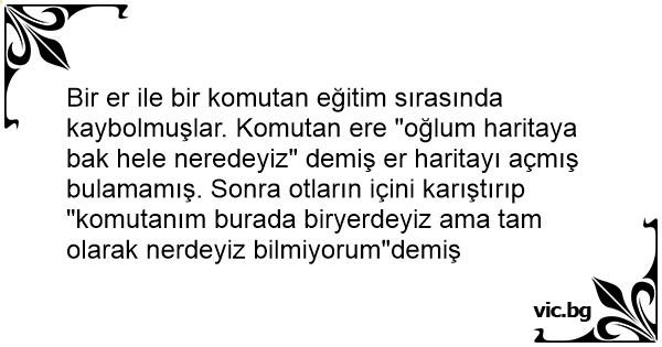 Bir er ile bir komutan eğitim sırasında kaybolmuşlar. Komutan ere "oğlum haritaya bak hele neredeyiz" demiş er haritayı açmış bulamamış. Sonra otların içini karıştırıp "komutanım burada biryerdeyiz ama tam olarak nerdeyiz bilmiyorum"demiş