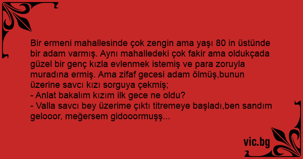 Bir ermeni mahallesinde çok zengin ama yaşı 80 in üstünde bir adam varmış. Aynı mahalledeki çok fakir ama oldukçada güzel bir genç kızla evlenmek istemiş ve para zoruyla muradına ermiş. Ama zifaf gecesi adam ölmüş,bunun üzerine savcı kızı sorguya çekmiş;