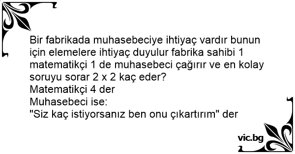 Bir fabrikada muhasebeciye ihtiyaç vardır bunun için elemelere ihtiyaç duyulur fabrika sahibi 1 matematikçi 1 de muhasebeci çağırır ve en kolay soruyu sorar 2 x 2 kaç eder?