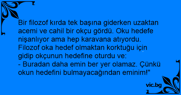 Bir filozof kırda tek başına giderken uzaktan acemi ve cahil bir okçu gördü. Oku hedefe nişanlıyor ama hep karavana atıyordu. Filozof oka hedef olmaktan korktuğu için gidip okçunun hedefine oturdu ve: