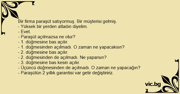 Temel paraşüt satıyormuş. Bir müşteri gelmiş: Beyefendi bu paraşütle 40.000 fitten atladık diyelim. Evet. Açılmazsa ne olacak? 1. düğmeye bas açılır. Ya açılmazsa? 2. düğmeye bas açılır. Ya...