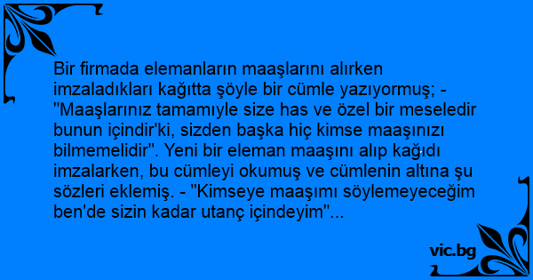 Bir firmada elemanların maaşlarını alırken imzaladıkları kağıtta şöyle bir cümle yazıyormuş; - "Maaşlarınız tamamıyle size has ve özel bir meseledir bunun içindir'ki, sizden başka hiç kimse maaşınızı bilmemelidir". Yeni bir eleman maaşını alıp kağıdı imzalarken, bu cümleyi okumuş ve cümlenin altına şu sözleri eklemiş. - "Kimseye maaşımı söylemeyeceğim ben'de sizin kadar utanç içindeyim"...