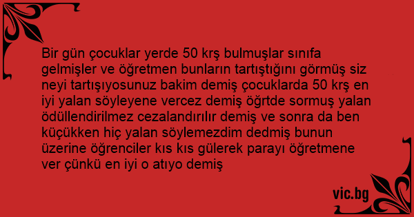 Bir gün çocuklar yerde 50 krş bulmuşlar sınıfa gelmişler ve öğretmen bunların tartıştığını görmüş siz neyi tartışıyosunuz bakim demiş çocuklarda 50 krş en iyi yalan söyleyene vercez demiş öğrtde sormuş yalan ödüllendirilmez cezalandırılır demiş ve sonra da ben küçükken hiç yalan söylemezdim dedmiş bunun üzerine öğrenciler kıs kıs gülerek parayı öğretmene ver çünkü en iyi o atıyo demiş