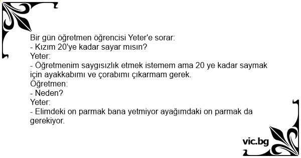 - Öğretmenim saygısızlık etmek istemem ama 20 ye kadar saymak için ayakkabımı ve çorabımı çıkarmam gerek.