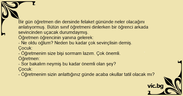 Bir gün öğretmen din dersinde felaket gününde neler olacağını anlatıyormuş. Bütün sınıf öğretmeni dinlerken bir öğrenci arkada sevincinden uçacak durumdaymış.