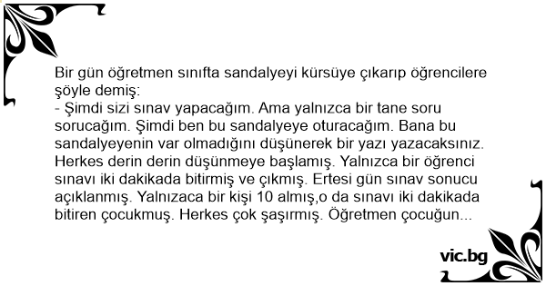 - Şimdi sizi sınav yapacağım. Ama yalnızca bir tane soru sorucağım. Şimdi ben bu sandalyeye oturacağım. Bana bu sandalyeyenin var olmadığını düşünerek bir yazı yazacaksınız. Herkes derin derin düşünmeye başlamış. Yalnızca bir öğrenci sınavı iki dakikada bitirmiş ve çıkmış. Ertesi gün sınav sonucu açıklanmış. Yalnızaca bir kişi 10 almış,o da sınavı iki dakikada bitiren çocukmuş. Herkes çok şaşırmış. Öğretmen çocuğun cevabını söylemiş: