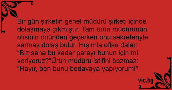 Bir gün şirketin genel müdürü şirketi içinde dolaşmaya çıkmıştır. Tam ürün müdürünün ofisinin önünden geçerken onu sekreteriyle sarmaş dolaş bulur. Hışımla ofise dalar: