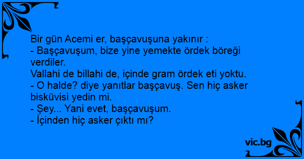 - O halde? diye yanıtlar başçavuş. Sen hiç asker bisküvisi yedin mi.