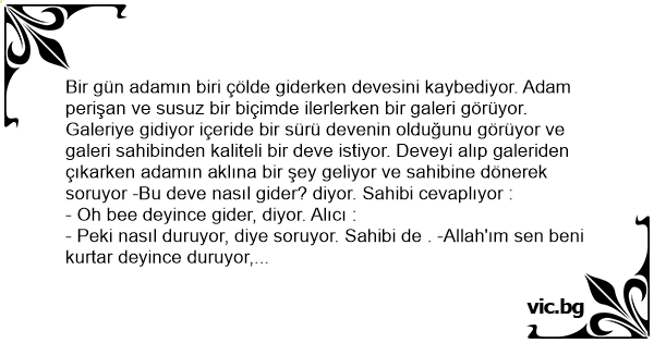 - Peki nasıl duruyor, diye soruyor. Sahibi de . -Allah'ım sen beni kurtar deyince duruyor, diyor. Adam deveyi alarak galeriden çıkıyor. -Oh bee diyerek, yola koyuluyor. Belli bir süre gittikten sonra adam ilerde bir uçurum görüyor ve deveyi nasıl durduracağını unutuyor. Deve tam uçurumun kenarına geldiğinde son anda adam :