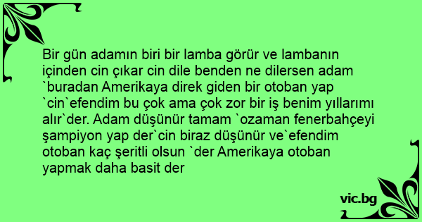 Bir gün adamın biri bir lamba görür ve lambanın içinden cin çıkar cin dile benden ne dilersen adam `buradan Amerikaya direk giden bir otoban yap `cin`efendim bu çok ama çok zor bir iş benim yıllarımı alır`der. Adam düşünür tamam `ozaman fenerbahçeyi şampiyon yap der`cin biraz düşünür ve`efendim otoban kaç şeritli olsun `der Amerikaya otoban yapmak daha basit der