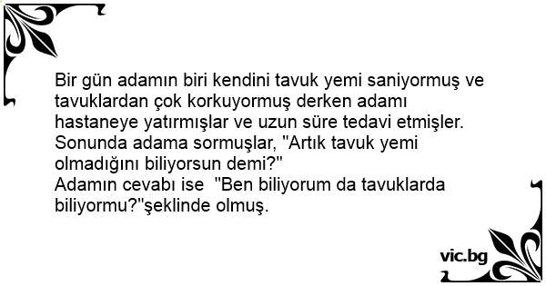 Bir gün adamın biri kendini tavuk yemi saniyormuş ve tavuklardan çok korkuyormuş derken adamı hastaneye yatırmışlar ve uzun süre tedavi etmişler.