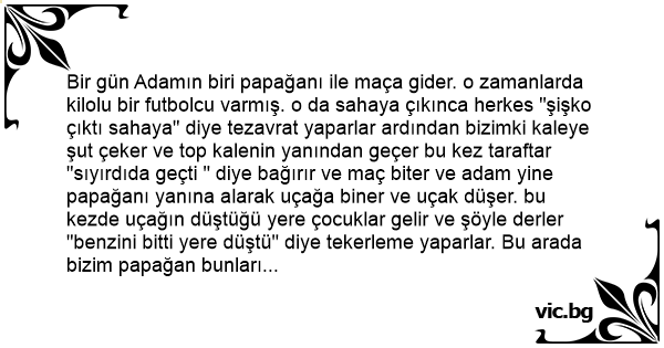Bir gün Adamın biri papağanı ile maça gider. o zamanlarda kilolu bir futbolcu varmış. o da sahaya çıkınca herkes "şişko çıktı sahaya" diye tezavrat yaparlar ardından bizimki kaleye şut çeker ve top kalenin yanından geçer bu kez taraftar "sıyırdıda geçti " diye bağırır ve maç biter ve adam yine papağanı yanına alarak uçağa biner ve uçak düşer. bu kezde uçağın düştüğü yere çocuklar gelir ve şöyle derler "benzini bitti yere düştü" diye tekerleme yaparlar. Bu arada bizim papağan bunları ezberlemektedir. aradan uzun bir zaman geçer ve papağanı bir gazino sahibi alır ve papağanı gazinonun baş köşesine koymuştur. her neyse şişman bir bayan sahneye çıkar ve bizim papağan başlar "şişko çıktı sahaya" der. bayan sinirlenir ve papağana bir tabak fırlatır ve tabak papağanın yanından geçer. papağan da tekrar mırıldanır "sıyırdıda geçti" diye. bu kez kadın sinirlenir ve bayılır. papağan tekrar mırıldanır:
