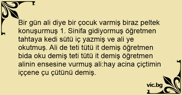 Bir gün ali diye bir çocuk varmiş biraz peltek konuşurmuş 1. Sinifa gidiyormuş öğretmen tahtaya kedi sütü iç yazmiş ve ali ye okutmuş. Ali de teti tütü it demiş öğretmen bida oku demiş teti tütü it demiş öğretmen alinin ensesine vurmuş ali:hay acina çiçtimin iççene çu çütünü demiş.