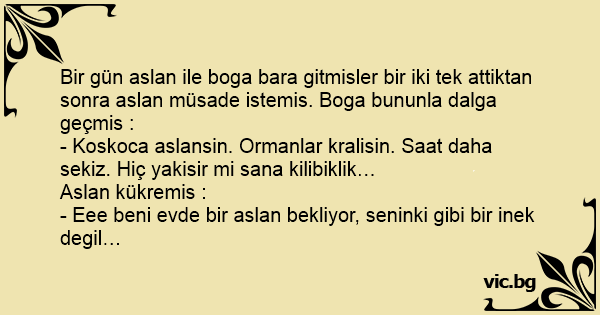 Bir gün aslan ile boga bara gitmisler bir iki tek attiktan sonra aslan müsade istemis. Boga bununla dalga geçmis :