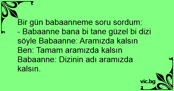 - Babaanne bana bi tane güzel bi dizi söyle Babaanne: Aramızda kalsın Ben: Tamam aramızda kalsın Babaanne: Dizinin adı aramızda kalsın.