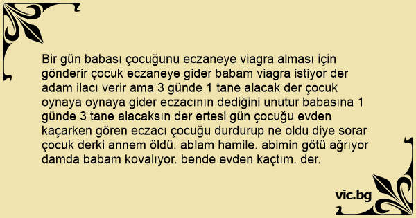 Bir gün babası çocuğunu eczaneye viаgrа alması için gönderir çocuk eczaneye gider babam viаgrа istiyor der adam ilacı verir ama 3 günde 1 tane alacak der çocuk oynaya oynaya gider eczacının dediğini unutur babasına 1 günde 3 tane alacaksın der ertesi gün çocuğu evden kaçarken gören eczacı çocuğu durdurup ne oldu diye sorar çocuk derki annem öldü. ablam hamile. abimin götü ağrıyor damda babam kovalıyor. bende evden kaçtım. der.