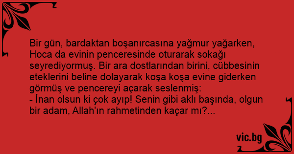 Bir gün, bardaktan boşanırcasına yağmur yağarken, Hoca da evinin penceresinde oturarak sokağı seyrediyormuş. Bir ara dostlarından birini, cübbesinin eteklerini beline dolayarak koşa koşa evine giderken görmüş ve pencereyi açarak seslenmiş: