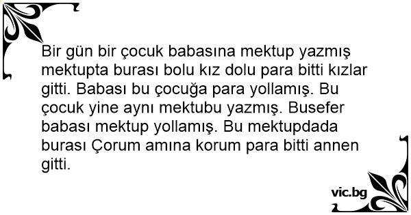 Bir gün bir çocuk babasına mektup yazmış mektupta burası bolu kız dolu para bitti kızlar gitti. Babası bu çocuğa para yollamış. Bu çocuk yine aynı mektubu yazmış. Busefer babası mektup yollamış. Bu mektupdada burası Çorum amına korum para bitti annen gitti.
