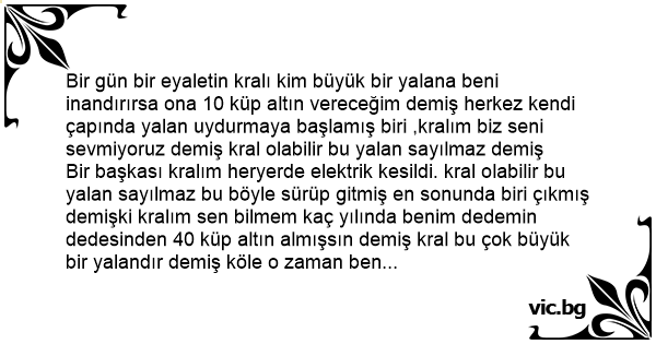 Bir gün bir eyaletin kralı kim büyük bir yalana beni inandırırsa ona 10 küp altın vereceğim demiş herkez kendi çapında yalan uydurmaya başlamış biri ,kralım biz seni sevmiyoruz demiş kral olabilir bu yalan sayılmaz demiş