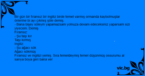 Bir gün bir fıransız bir ingiliz birde temel varmış ormanda kaybolmuşlar önlerine bi ayı çıkmış şöle demiş.