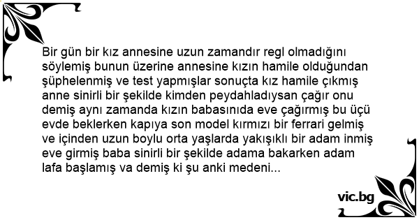 Bir gün bir kız annesine uzun zamandır regl olmadığını söylemiş bunun üzerine annesine kızın hamile olduğundan şüphelenmiş ve test yapmışlar sonuçta kız hamile çıkmış anne sinirli bir şekilde kimden peydahladıysan çağır onu demiş aynı zamanda kızın babasınıda eve çağırmış bu üçü evde beklerken kapıya son model kırmızı bir ferrari gelmiş ve içinden uzun boylu orta yaşlarda yakışıklı bir adam inmiş eve girmiş baba sinirli bir şekilde adama bakarken adam lafa başlamış va demiş ki şu anki medeni durumumdan dolayı kızınızla evlenemem bunun üzerine baba iyice sinirlenmiş ama adam baba lafa girmeden devam etmiş : ama çocuk erkek olursa babanın hesabına bir miyon dolar anneye bir villa , çocuk kız olursa babaya gene bir milyon dolar anneye bir araba , eğer ikiz olursa ham anneye hem babaya bir milyon dolar , şayet düşük olursa diye söze tam devam edicekken baba araya girmiş adamın sırtını sıvazlamış ve demiş ki düşük olursa bi daha .. Ikersin yavrum