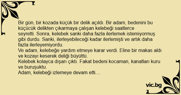 Adamın bu aceleci iyiliği içinde anlayamadığı, bu kısıtlayıcı kozanın ve kelebeğin o küçücük delikten dışarı çıkmak için verdiği mücadelenin, kelebek için gerekli olduğuydu. Çünkü bu, Allah'ın, yaşam sıvısının kelebeğin bedeninden kanatlarına doğru akmasını sağlamak için yarattığı yoldu. Böylece kelebek kozadan kurtulduğu anda uçmaya hazır olabilecekti.