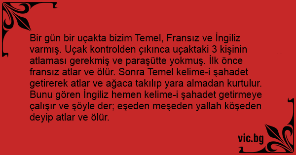 Bir gün bir uçakta bizim Temel, Fransız ve İngiliz varmış. Uçak kontrolden çıkınca uçaktaki 3 kişinin atlaması gerekmiş ve paraşütte yokmuş. İlk önce fransız atlar ve ölür. Sonra Temel kelime-i şahadet getirerek atlar ve ağaca takılıp yara almadan kurtulur. Bunu gören İngiliz hemen kelime-i şahadet getirmeye çalışır ve şöyle der; eşeden meşeden yallah köşeden deyip atlar ve ölür.