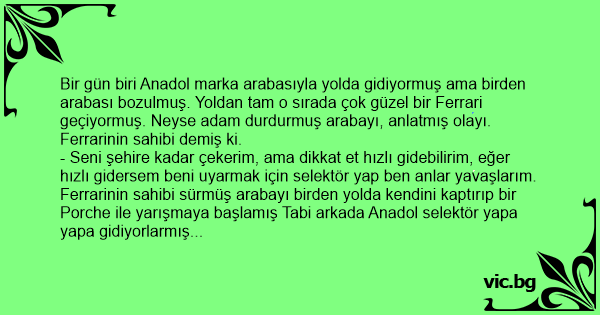 Bir gün biri Anadol marka arabasıyla yolda gidiyormuş ama birden arabası bozulmuş. Yoldan tam o sırada çok güzel bir Ferrari geçiyormuş. Neyse adam durdurmuş arabayı, anlatmış olayı. Ferrarinin sahibi demiş ki.