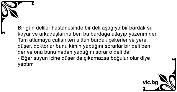 Bir gün deliler hastanesinde bir deli aşağıya bir bardak su koyar ve arkadaşlarına ben bu bardağa atlayıp yüzerim der.