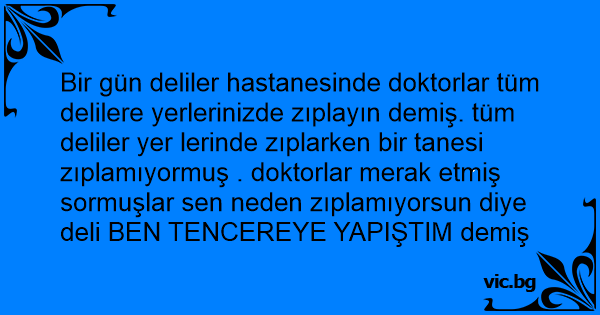 Bir gün deliler hastanesinde doktorlar tüm delilere yerlerinizde zıplayın demiş. tüm deliler yer lerinde zıplarken bir tanesi zıplamıyormuş . doktorlar merak etmiş sormuşlar sen neden zıplamıyorsun diye deli BEN TENCEREYE YAPIŞTIM demiş