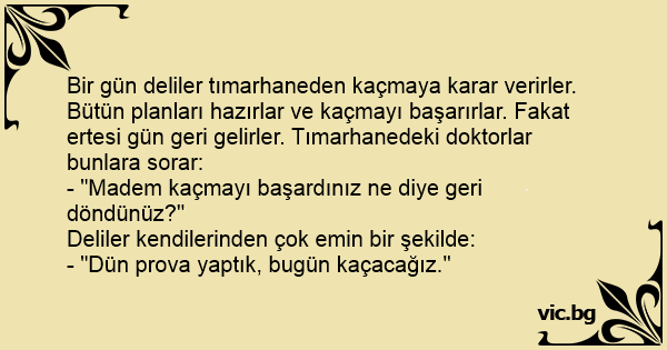Bir gün deliler tımarhaneden kaçmaya karar verirler. Bütün planları hazırlar ve kaçmayı başarırlar. Fakat ertesi gün geri gelirler. Tımarhanedeki doktorlar bunlara sorar: