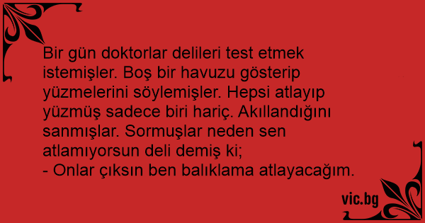 Bir gün doktorlar delileri test etmek istemişler. Boş bir havuzu gösterip yüzmelerini söylemişler. Hepsi atlayıp yüzmüş sadece biri hariç. Akıllandığını sanmışlar. Sormuşlar neden sen atlamıyorsun deli demiş ki;