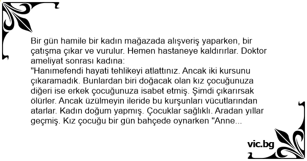 "Hanımefendi hayati tehlikeyi atlattınız. Ancak iki kursunu çıkaramadık. Bunlardan biri doğacak olan kız çocuğunuza diğeri ise erkek çocuğunuza isabet etmiş. Şimdi çıkarırsak ölürler. Ancak üzülmeyin ileride bu kurşunları vücutlarından atarlar. Kadın doğum yapmış. Çocuklar sağlıklı. Aradan yıllar geçmiş. Kız çocuğu bir gün bahçede oynarken "Anne anne çabuk gel" diye bağırmış. Annesi telaş içinde "Ne oldu kızım?" diye kosmuş. "