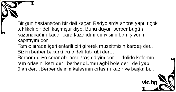 Berber deliye sorar abi nasıl traş ediyim der … delide kafamın tam ortasını kazı der.. berber olurmu ağbi böle der.. deli yap ülen der…Berber delinin kafasının ortasını kazır ve başka bi arzun warmı abi diye sorar…