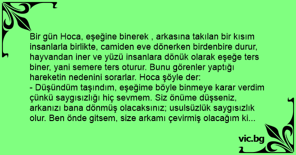 - Düşündüm taşındım, eşeğime böyle binmeye karar verdim çünkü saygısızlığı hiç sevmem. Siz önüme düşseniz, arkanızı bana dönmüş olacaksınız; usulsüzlük saygısızlık olur. Ben önde gitsem, size arkamı çevirmiş olacağım ki bu da doğru değildir. Böyle ters bindiğim zaman ise hem ben önünüzden giderim, siz de ardımdan gelmiş olursunuz; hem de karşı karşıya bulunuruz!