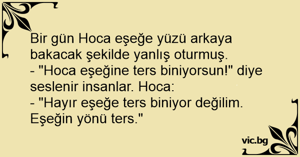 - "Hoca eşeğine ters biniyorsun!" diye seslenir insanlar. Hoca: